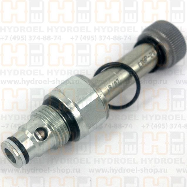 Клапан E08P-20S картриджного исполнения двухлинейный предназначен для управления потоком рабочей жидкости. При подаче напряжения питания на электромагнит управления клапаном (не входит в комплект, см. ниже), золотник клапана переключается из закрытого положения в открытое и обеспечивает свободный проход рабочей жидкости.